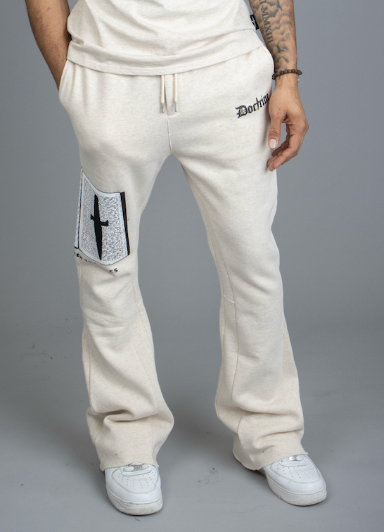 Step up your jogger game with the DOCTRINE SIGNATURE 2.0 FLARE JOGGER HEATHER OATMEAL. Made from a soft cotton and poly fleece blend, these joggers feature a unique flare style and eye-catching dagger script and logo prints. Stay comfortable and stylish on your next workout or lounge session.